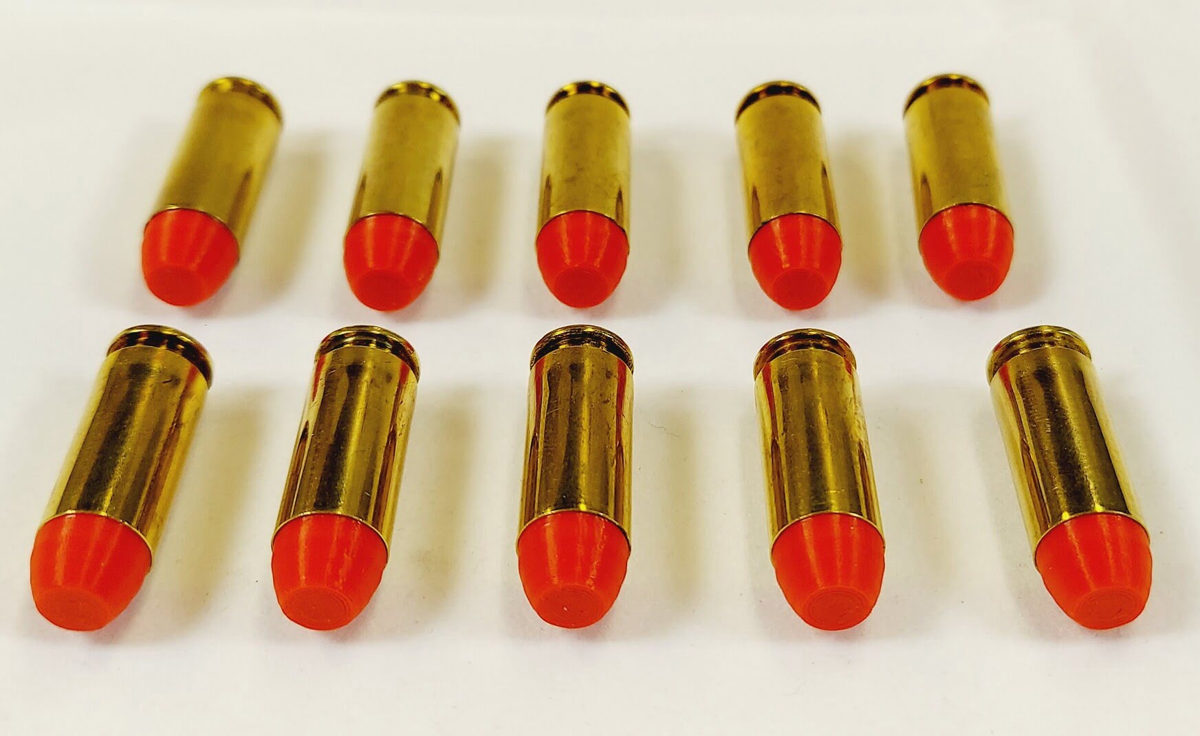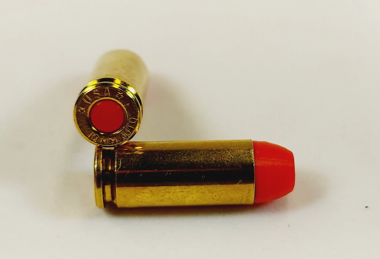 - 10mm AUTO Snap caps made from new or once fired 10mm AUTO brass cases with colored plastic bullet and primer pocket filled with colored rubber.