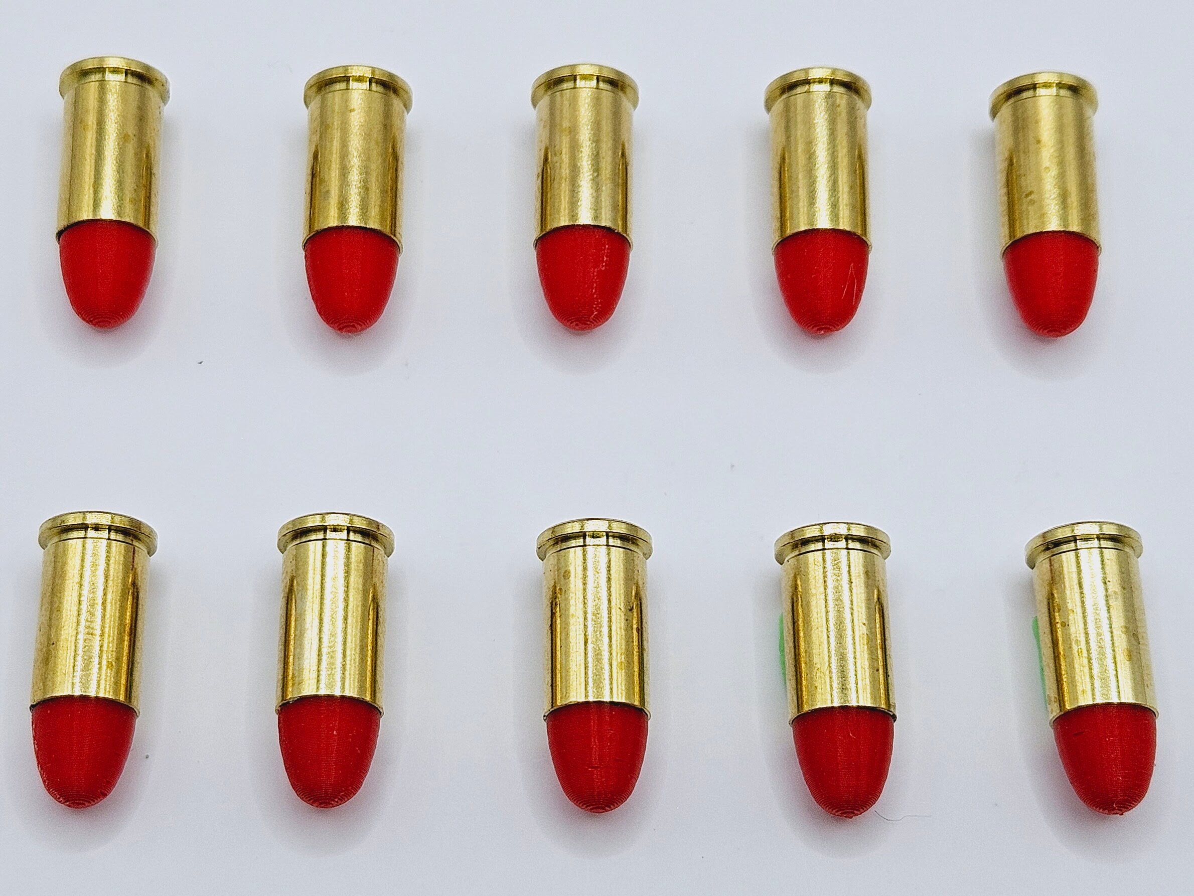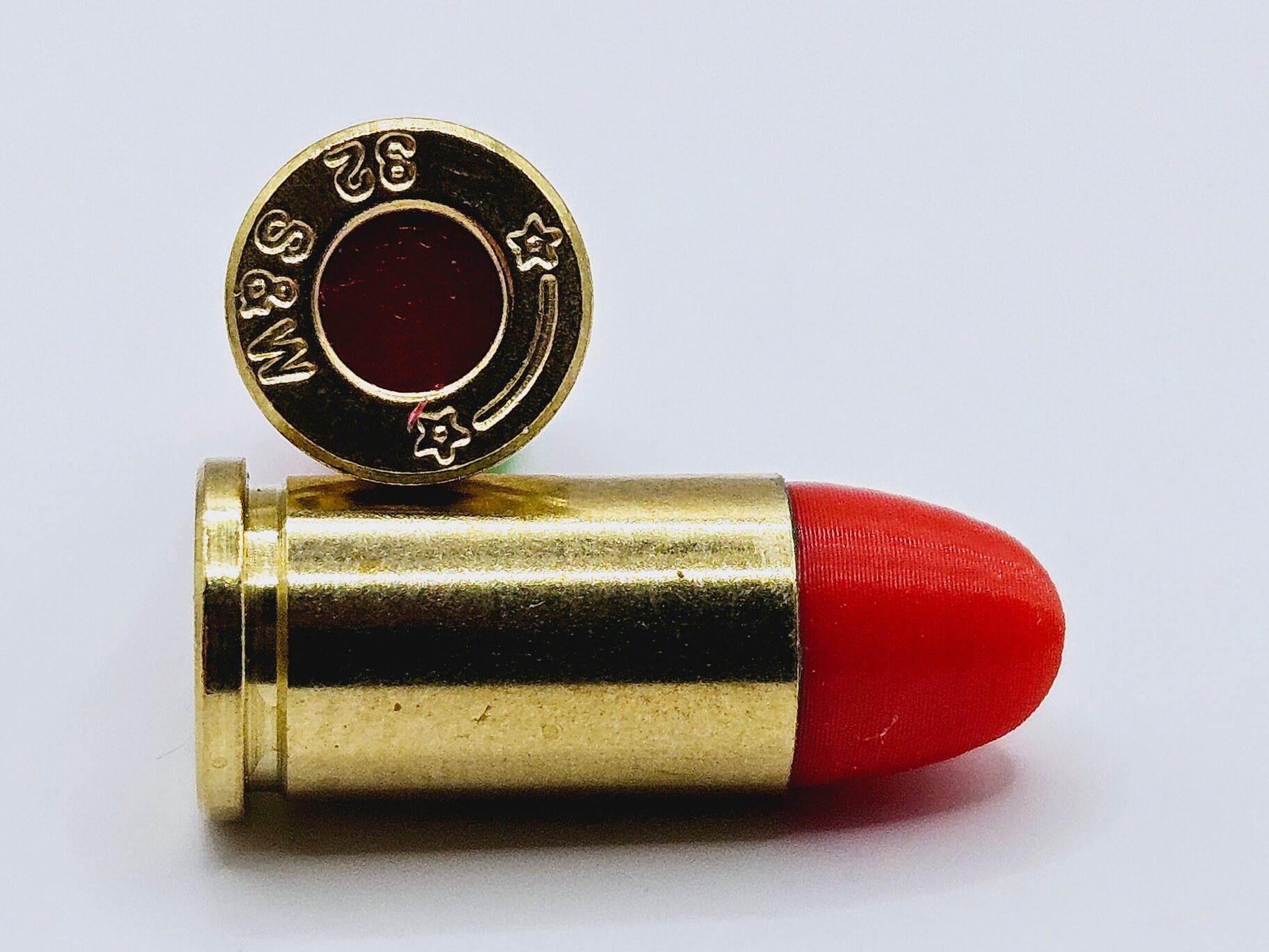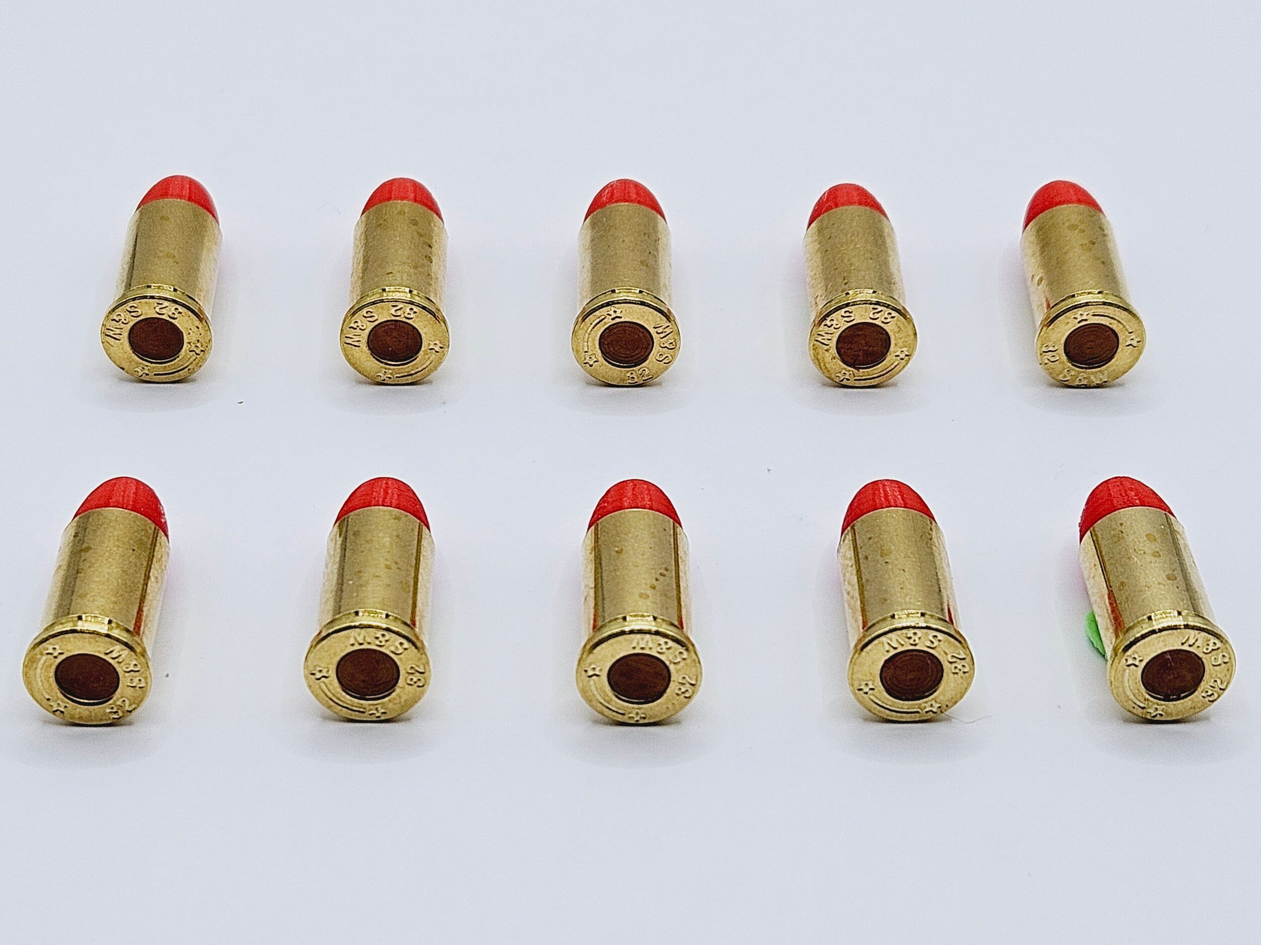 - 32 S&W Snap caps made from new or once fired 32 S&W brass cases with colored plastic bullet and primer pocket filled with colored rubber.