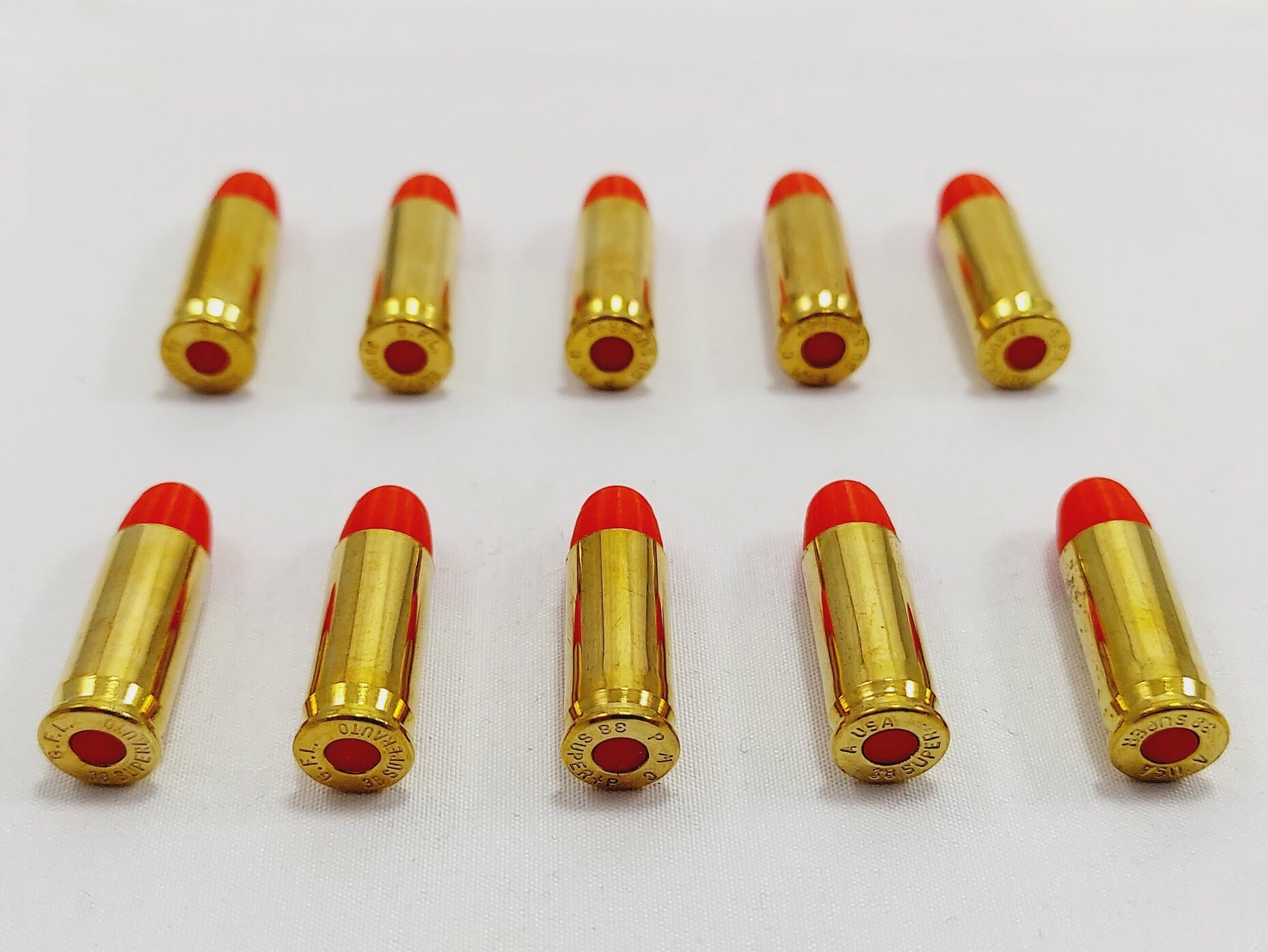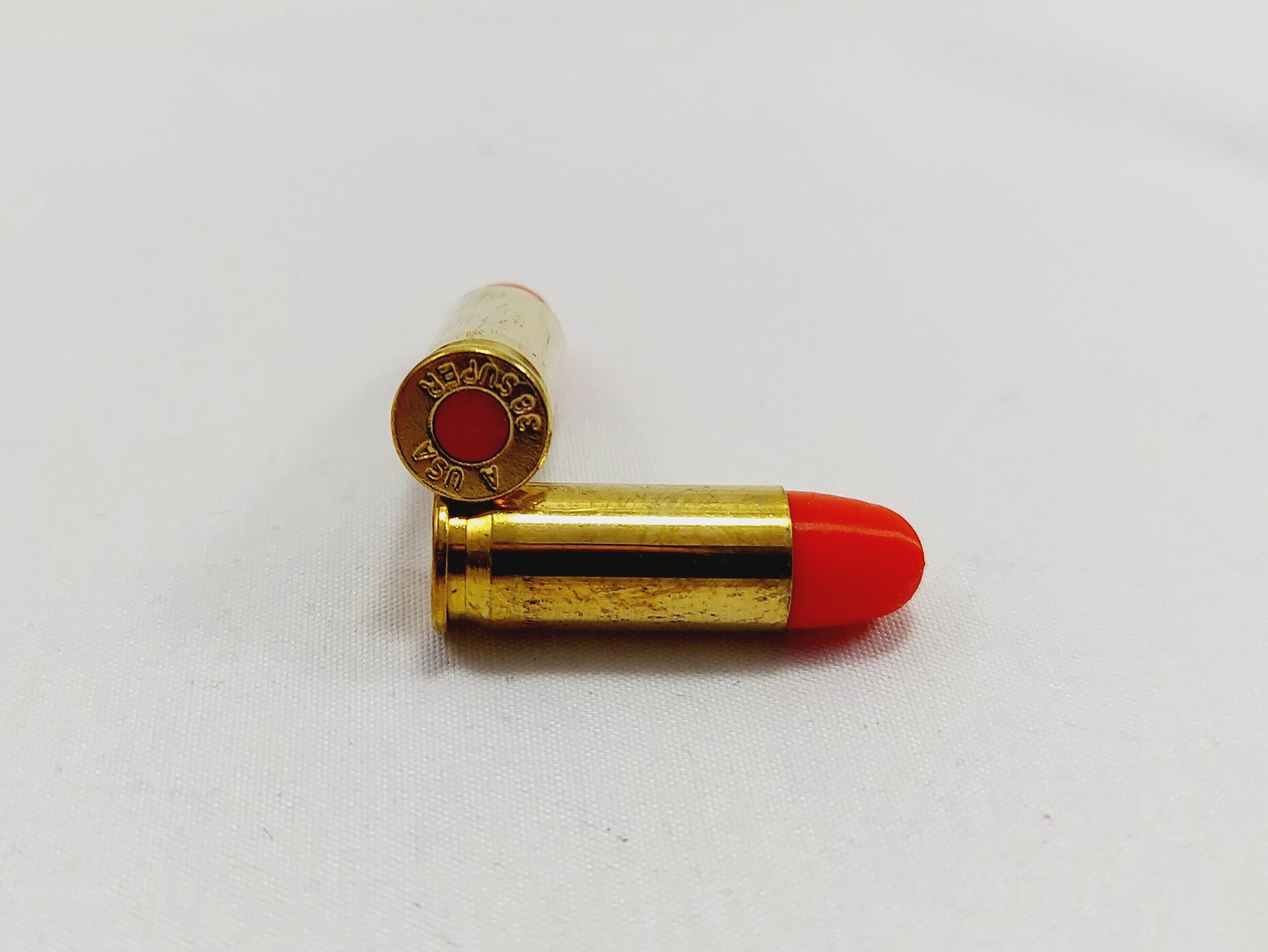 - 38 Super Snap caps made from new or once fired 38 Super brass cases with colored plastic bullet and primer pocket filled with colored rubber.