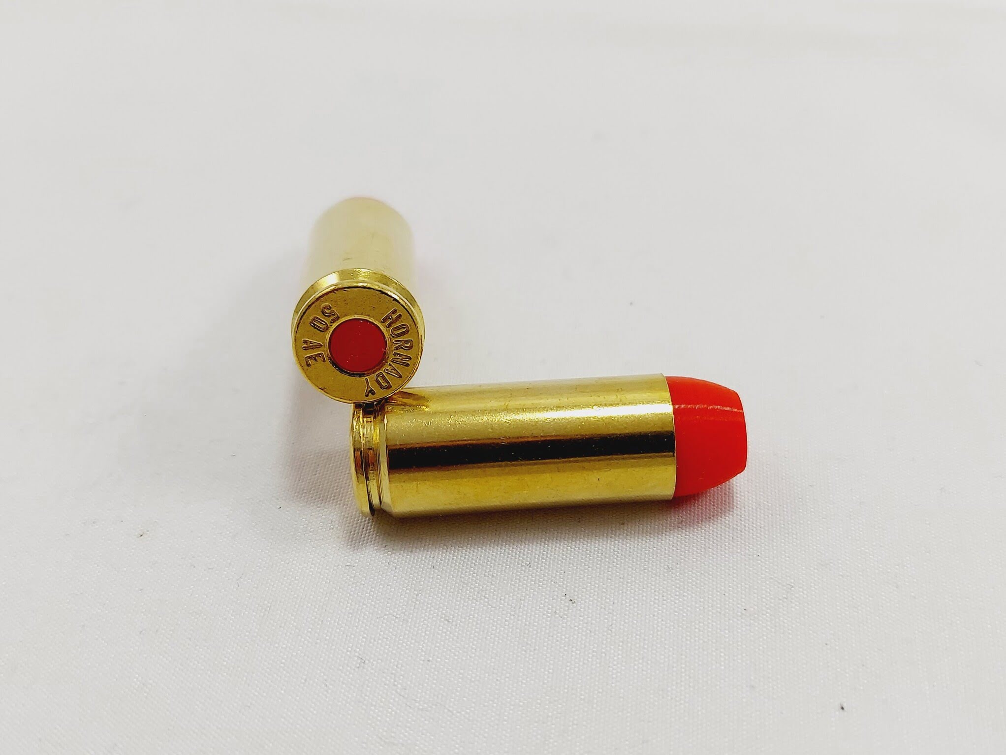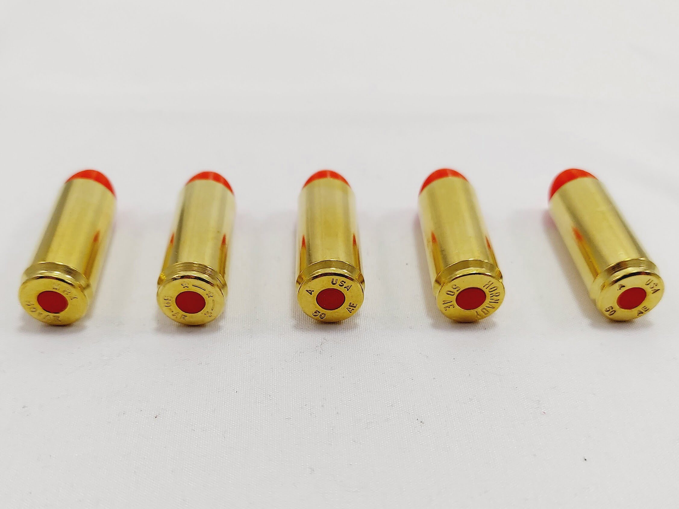 - 50 Action Express Dummy Training Rounds Snap caps made from new or once fired 50 AE brass cases with colored plastic bullet and primer pocket filled with colored rubber.