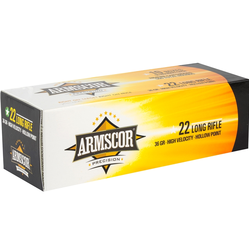 Armscor Precision 22 Long Rifle 36-Grain high-velocity hollow points are a great choice for a wide variety of rimfire shooting applications. Suitable for sport shooting, competition, hunting varmint, or target practice, these accurate 36-grain hollow points will run reliably from your 22 LR pistol or rifle, from the box mag or tube mag, and in any semi-auto or bolt action platform.